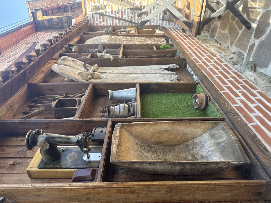 The image depicts an outdoor, rustic wall display of antique objects in Krumovgrad, Bulgaria, under bright daylight. The display is integrated into a multi-layered wall structure. The lowest section of the wall consists of rough-hewn stone, transitioning to a red brick mid-section. Above this, a large wooden framework is built, forming numerous cubbies and shelves filled with various historical artifacts. Tiered terracotta roof tiles are visible above the wooden display. Within the shelves, notable objects include: * An antique, black cast-iron sewing machine head mounted on a golden-framed wooden panel, positioned at the upper left. * Below the sewing machine, two vintage cast-iron clothes irons. * A large, vertically oriented, carved wooden trough or bread kneader occupies a prominent lower left cubby. * A metal kerosene lantern and a grey metal pitcher are displayed together on a shelf. * Further along the display, various wooden tools, parts of old farm implements, metal hooks, and other rustic items are arranged in the cubbies. * Some shelf bottoms are lined with artificial green turf, one holding a small, brown clay pot with a tiny green plant. Other shelves contain decorative gravel. To the immediate right of the display, the ground is paved with irregularly shaped stone slabs. A wooden table with an X-shaped black metal base is partially visible in the lower right foreground. In the upper background, under a clear blue sky, parts of a distant red brick building with terracotta roof tiles are visible. No people are present in the scene.