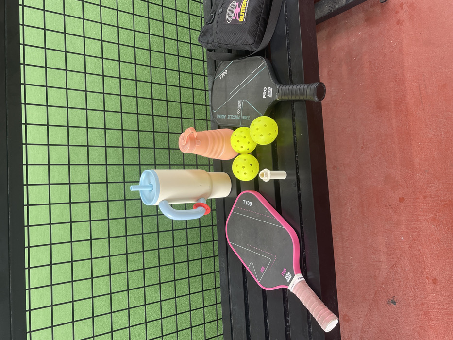 A pickleball court bench holds an assortment of items