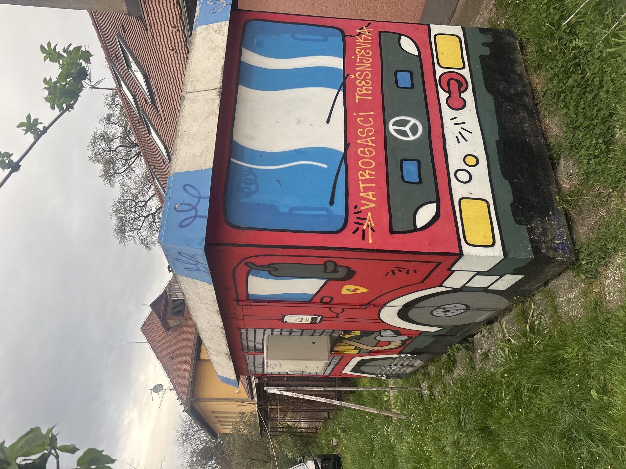 A utility box, painted with cartoon style fire truck images, is in Zagreb, Croatia. The box is located in a grassy area near a street and adjacent to a building. The words "VATROGASCI TREŠNJEVKA" are visible on the painted fire truck. The sky is overcast.
