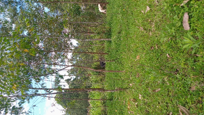 The scene, located in Gesima ward, Kenya, depicts an outdoor environment within a sparse woodland. The foreground consists of dense green ground cover, primarily grasses and various low-lying plants, with scattered dry brown leaves. Numerous slender trees with light brown trunks and green foliage are distributed vertically across the midground, forming a partial canopy. In the middle-left, a dark-colored goat or sheep is partially visible, positioned amongst the trees and vegetation, facing right. To the right, a white or light-colored goat or sheep is observed with its head lowered towards the ground, indicative of grazing. The background shows denser green foliage, and a partially cloudy blue sky is visible through the tree canopy at the top. No human figures are present.