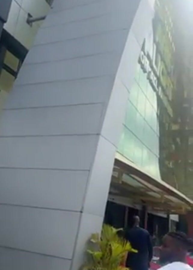 exterior of a modern building with a curved design and reflective glass windows