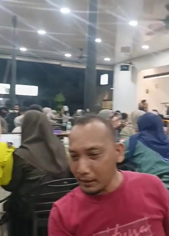 interior of a busy restaurant with many people seated at tables and some staff members behind a counter. The restaurant has a modern design with white walls and black accents. The lighting is bright, with multiple ceiling lights. The customers are dressed in various styles of clothing, and some women are wearing hijabs. Some of the customers appear to be eating and talking with each other. Staff members are working behind the counter. The restaurant's name, "PYRAMID Kopitiam" is visible on the wall above the counter. A fan is rotating on the wall near the counter. The overall atmosphere seems lively and social.