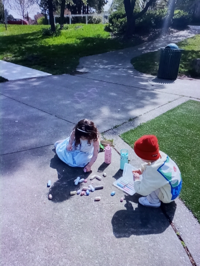 - "The image depicts an outdoor scene in Wilkszyn, Poland, showing two young children engaged in chalk drawing on a paved path under clear, sunny conditions" by FM-a9LKm1, licensed under CC BY 4.0