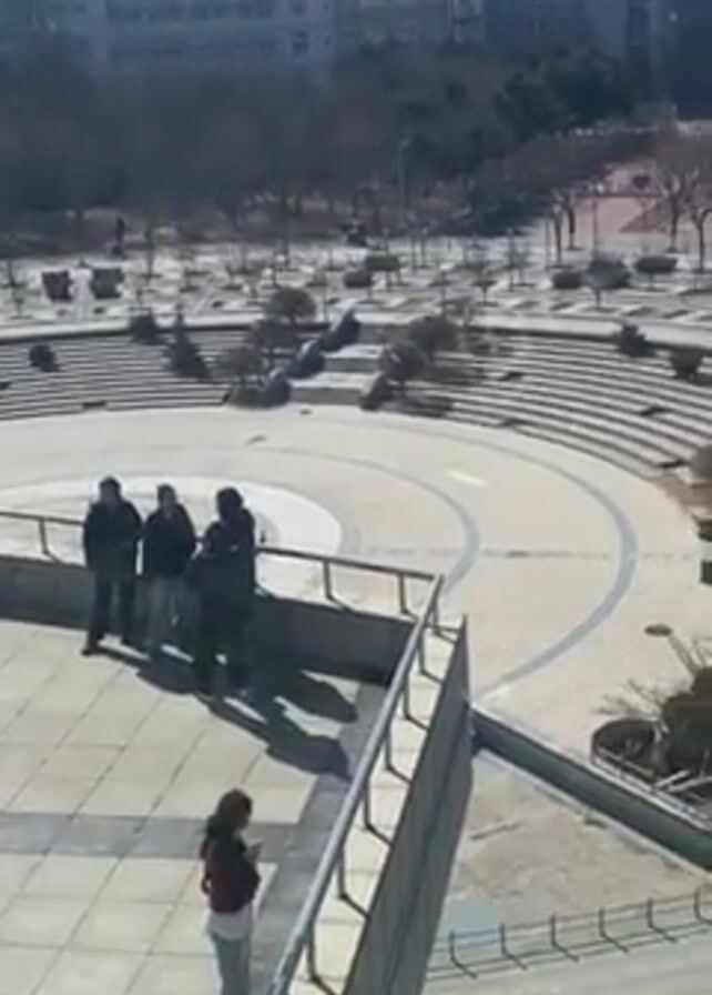 partially sunny outdoor scene. There are at least four people standing on a raised platform with a metal railing. A person in a maroon shirt is partially visible, standing slightly below them. Beyond the platform is a large, semi-circular outdoor amphitheater with tiered seating. The seating is made of gray material, possibly concrete. Scattered small trees and shrubbery are planted throughout the amphitheater. In the background are several multi-story buildings with gray facades. The sky is clear and blue. People are seen walking along paths within the amphitheater area.