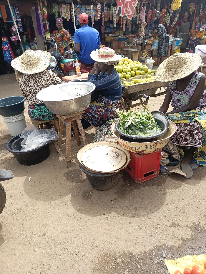 Three women wearing straw hats are seated at a bustling outdoor market. Each woman has a display of produce in front of her; one has a large silver bowl, another has green vegetables in a black bowl, and the third is next to a cart piled high with oranges. Other people are visible in the background, including a man on a motorcycle and various vendors under a covered storefront lined with goods. Buckets, stools, and crates support the wares. The ground is dry and dusty.