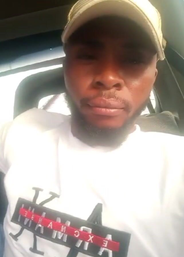 man in a car. He is wearing a white t-shirt with a logo and a striped baseball cap. He has dark skin and a short beard. He looks directly at the camera. The car's interior is visible, with the dashboard and ceiling. A seatbelt is across his chest. The light suggests the video was taken during the day. The car is moving, as suggested by the external noise.