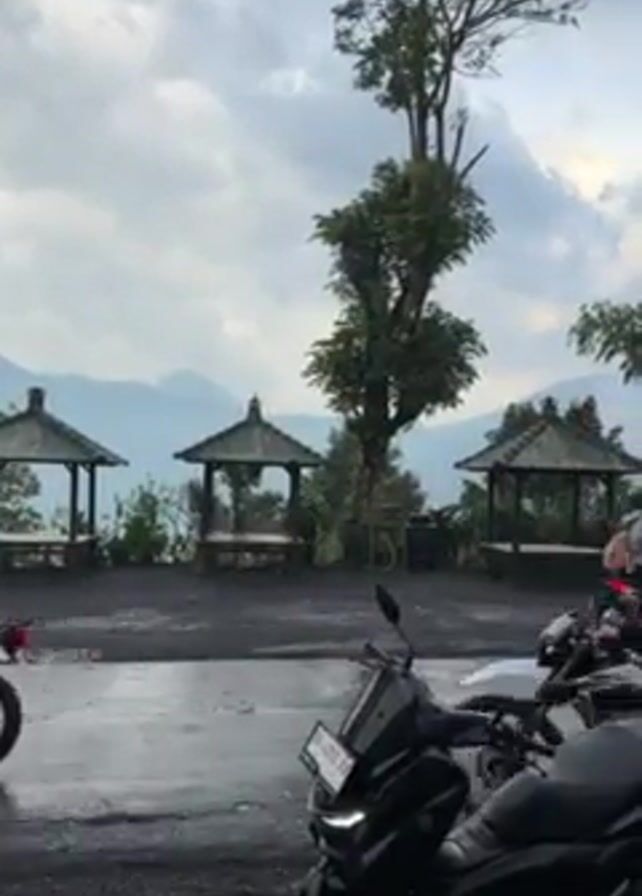 group of people on motorcycles, apparently preparing to depart from a paved area. In the foreground is a black Yamaha scooter parked facing the camera. Behind it are several other motorcycles, mostly dual-sport or adventure bikes, each with a rider wearing a helmet. The riders are starting their engines and some are beginning to move forward. The setting is a scenic overlook with small pavilions and a view of distant mountains under a cloudy sky. The overall atmosphere is one of an adventure or touring group getting ready to continue their journey.