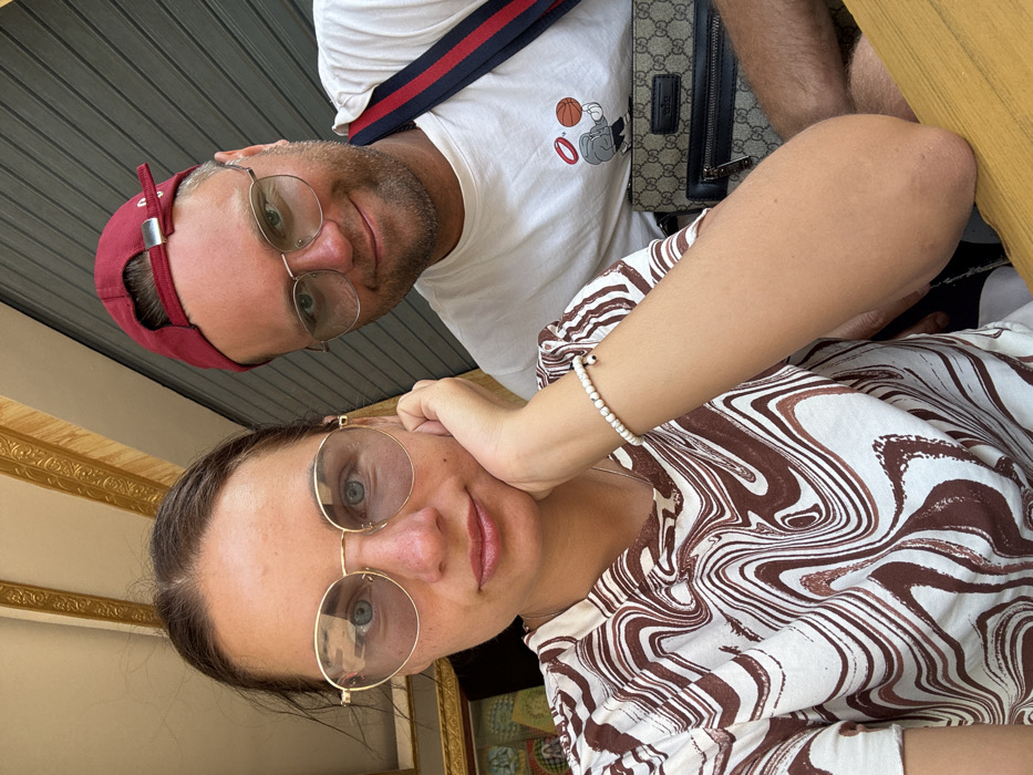A selfie-style shot features two people. The man wears a white t-shirt with a cartoon graphic, a red baseball cap, and glasses. He also has a dark-colored bag with a patterned print slung across his shoulder. The woman, in the foreground, is wearing a white and brown swirling pattern shirt and glasses. A white beaded bracelet adorns her wrist. A gilded ornate picture frame is seen in the corner, suggesting an indoor setting.