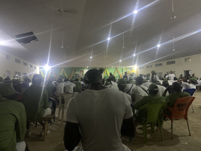 The image displays a densely populated indoor hall in Kubi A, Nigeria, where approximately 60-80 individuals, predominantly young adults, are seated and facing forward. The majority of attendees are dressed in olive green and white attire, consistent with National Youth Service Corps (NYSC) uniforms, including olive green caps, white t-shirts, and olive green trousers or shirts. Seating arrangements consist of various plastic chairs, one orange chair explicitly labeled "NYSC HALL," and several wooden benches. The hall features light-colored walls and a high ceiling equipped with multiple fluorescent light fixtures and several white ceiling fans. A section of the ceiling exhibits a missing or damaged panel, exposing a dark void. The focal point at the front of the hall is adorned with green and yellow fabric drapes and is intensely illuminated by several bright artificial lights, creating prominent lens flares. A large screen or banner is visible to the right of this decorated area. The floor is a light-colored, possibly concrete or tiled surface. The assembled group suggests participation in a formal gathering, lecture, or event.