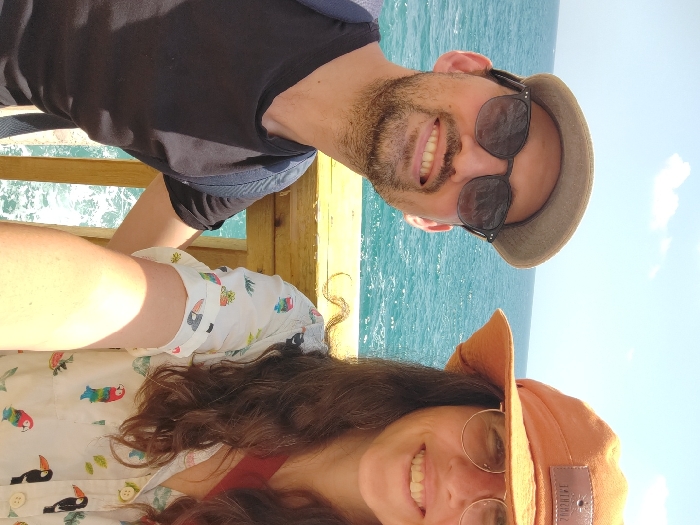 The image displays two smiling individuals, one male and one female, captured in a selfie-style photograph overlooking the sea, located in the Mate Asher Regional Council, Israel
