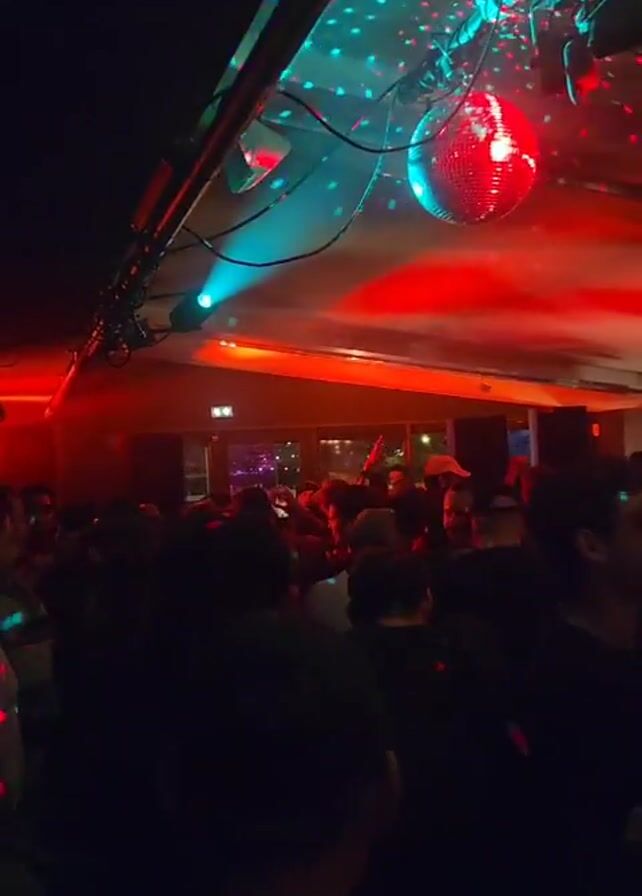 crowded indoor party. The room is dimly lit, with colorful lights in red, green and blue. There is a disco ball hanging from the ceiling. The camera angle is looking up at the ceiling and across the crowd of people. The music playing appears to be dance music.