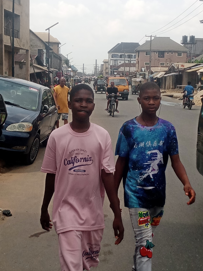 An urban street scene in Aba, Nigeria, captured during daylight under an overcast sky, depicts two young males walking hand-in-hand towards the viewer in the foreground