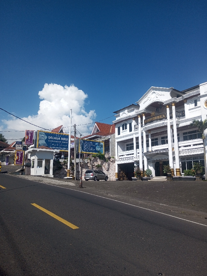 The image displays a daytime street view in the city of Niz Lakuk, India. In the foreground, a dark asphalt road, marked with a solid yellow line on its left, extends into the distance. To the right of the road, a sidewalk or unpaved area runs alongside several structures. The dominant feature on the right is a multi-story, white building exhibiting ornate classical architecture, distinguished by numerous white columns with gold accents, balustrades, and intricate facade detailing. A sign reading "DELAGA BIRU Convention Hotel" is visible on its upper front. Adjacent to this building and slightly to its left, a silver compact sedan is parked on an elevated, unpaved area. Further left, a large blue billboard displays "DELAGA BIRU Convention Hotel," situated above a small, white, possibly security or information booth. Additional commercial signage, including one with "ROTI UNYIL" text, is present on utility poles along the street. The background includes more buildings with reddish-brown tiled roofs and scattered green foliage. Overhead utility wires traverse the scene. The sky is clear and deep blue, featuring a single, large, white cumulus cloud prominently positioned in the upper left. The scene is well-lit by bright sunlight, casting distinct shadows. No people are visible.