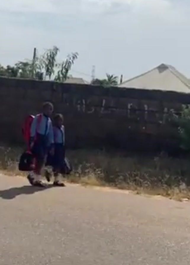 Two young girls in school uniforms are walking down a paved road. The girl on the left has a large pink backpack and a black bag. The girl on the right has a backpack and a smaller black bag. There is a stone wall to their right and houses are visible in the background. The sky is blue with some clouds.