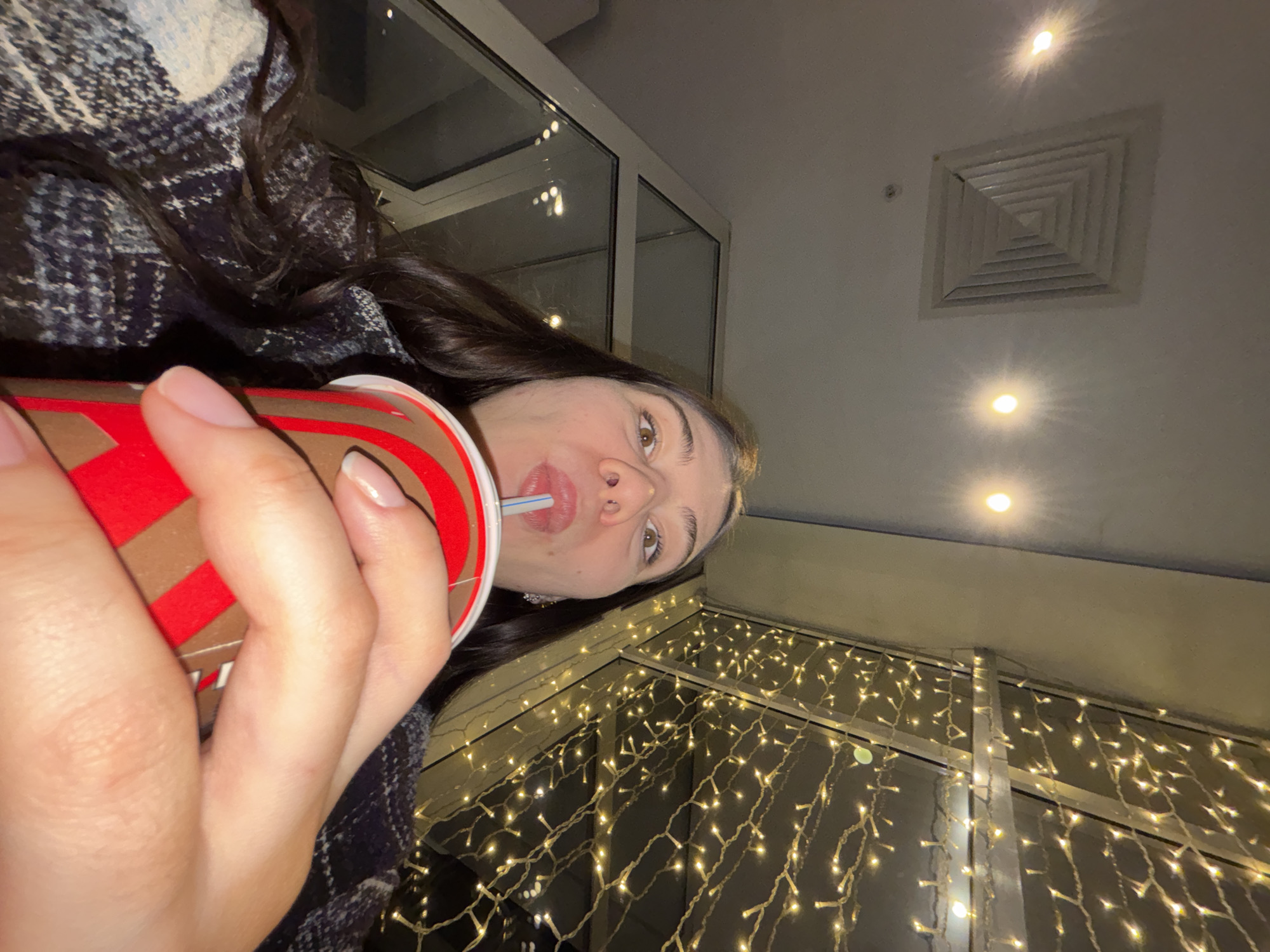 A selfie taken indoors in Perm, Russia, shows a woman drinking from a red and brown cup with a straw. The background shows a window with light strings, and the ceiling has lights and a vent. The woman is wearing a patterned jacket.
