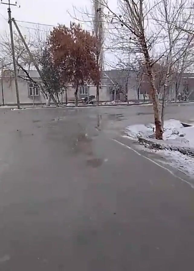 street scene in what appears to be a small town or village during a day of light snowfall. The road is wet and shiny, suggesting recent rain or melting snow. Patches of snow remain on the sides of the road and on the ground near the curb. The buildings lining the street are mostly single-story, possibly houses or small businesses, with a light-colored exterior. Trees with bare branches are scattered along the street, and a few retain some brown leaves. Utility poles with wires overhead are visible. No people or vehicles are seen in the shot.