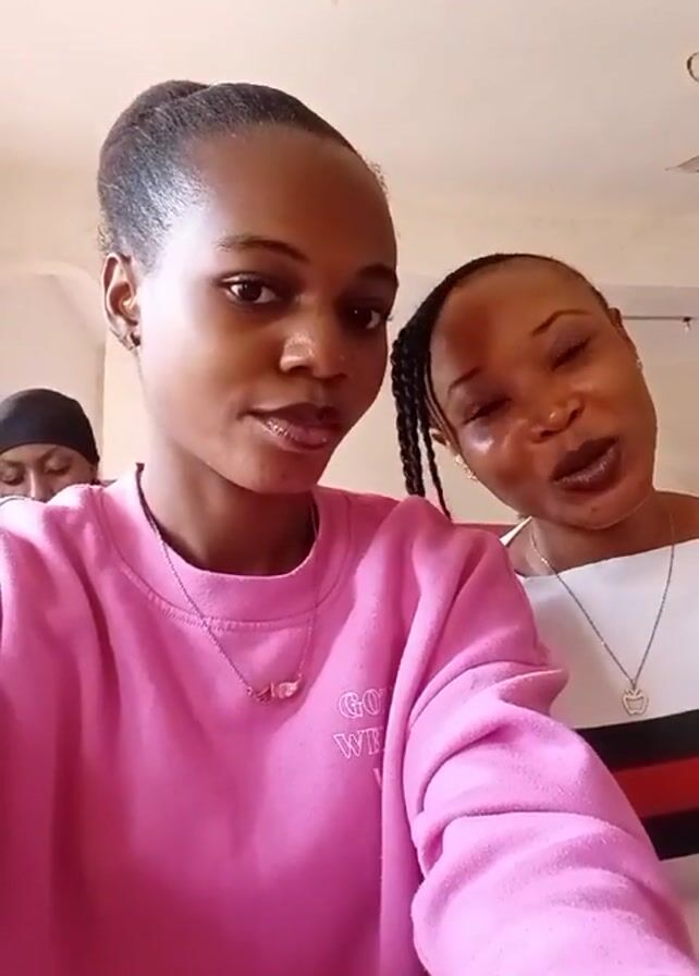 Two young women stand close together, smiling and looking directly at the camera in a selfie-style video. The woman on the left wears a pink sweatshirt with a necklace, and her dark hair is pulled back in a bun. The woman on the right is wearing a white shirt with a black and green stripe and a necklace, and her hair is styled in small braids. They are in an indoor space with light-colored walls and possibly a window or doorway visible in the background. A person wearing a black head covering is partially visible behind the woman on the left. The women appear to be speaking or singing, and they seem happy.