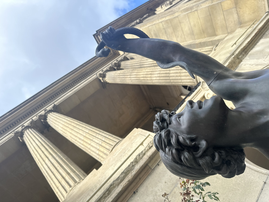 The image presents an upward-angled view of a dark bronze statue positioned in front of a classical building under a partially cloudy sky