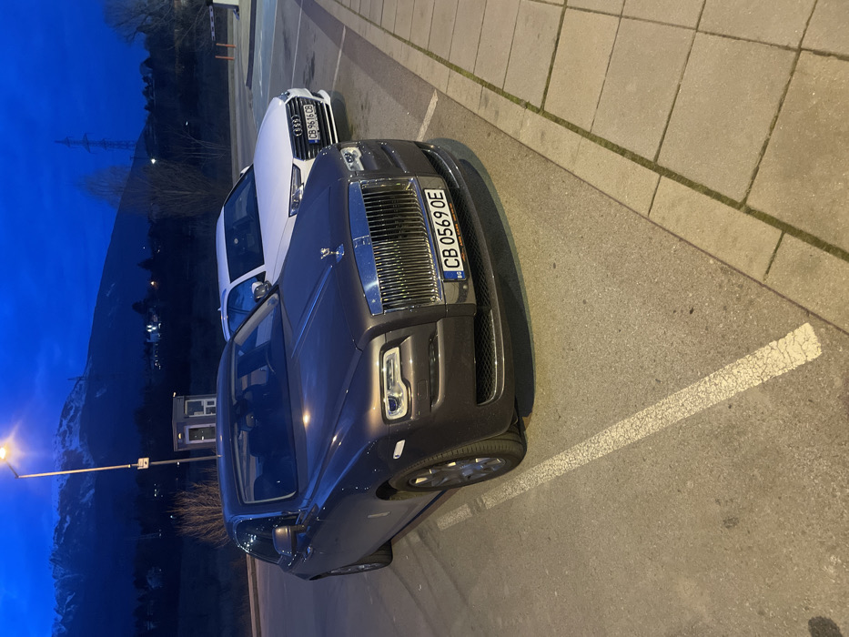 The image depicts an outdoor parking lot scene in Sofia, Bulgaria, during twilight or early night. In the foreground, a dark brown/grey Rolls-Royce Ghost is parked, facing towards the viewer. Its front license plate, "CB 0569 OE," is clearly visible, indicating registration in Sofia, Bulgaria. The car's chrome grille, headlights, and the iconic Spirit of Ecstasy emblem are prominent. To the right and slightly behind the Rolls-Royce, a white Audi sedan is parked, displaying Bulgarian license plate "CB 9616 CB." Both vehicles are situated on an asphalt surface with faded white parking lines, adjacent to a concrete sidewalk paved with square blocks on the right side of the frame. A tall, illuminated street lamp stands to the left of the Rolls-Royce, casting light on the immediate area. Behind the street lamp, a small, light-colored structure, possibly a guard booth or utility box, is visible. The middle ground features sparse, bare trees and shrubs. The background is dominated by a large, dark mountain range with visible patches of snow on its upper slopes, consistent with Vitosha Mountain, a landmark bordering Sofia. Distant lights from buildings or infrastructure are scattered across the mountainside. An electricity pylon is also discernible on a distant slope against the deep blue, twilight sky. No individuals or active interactions are visible in the scene.