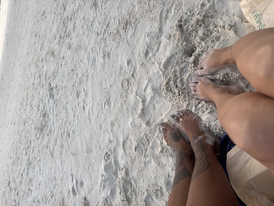 Two pairs of feet sink into white sand. One pair displays dark nail polish and geometric leg tattoos. The other pair is fair-skinned. The sand is undisturbed except for the footprints. A paper bag sits beside the legs. The view is from above.
