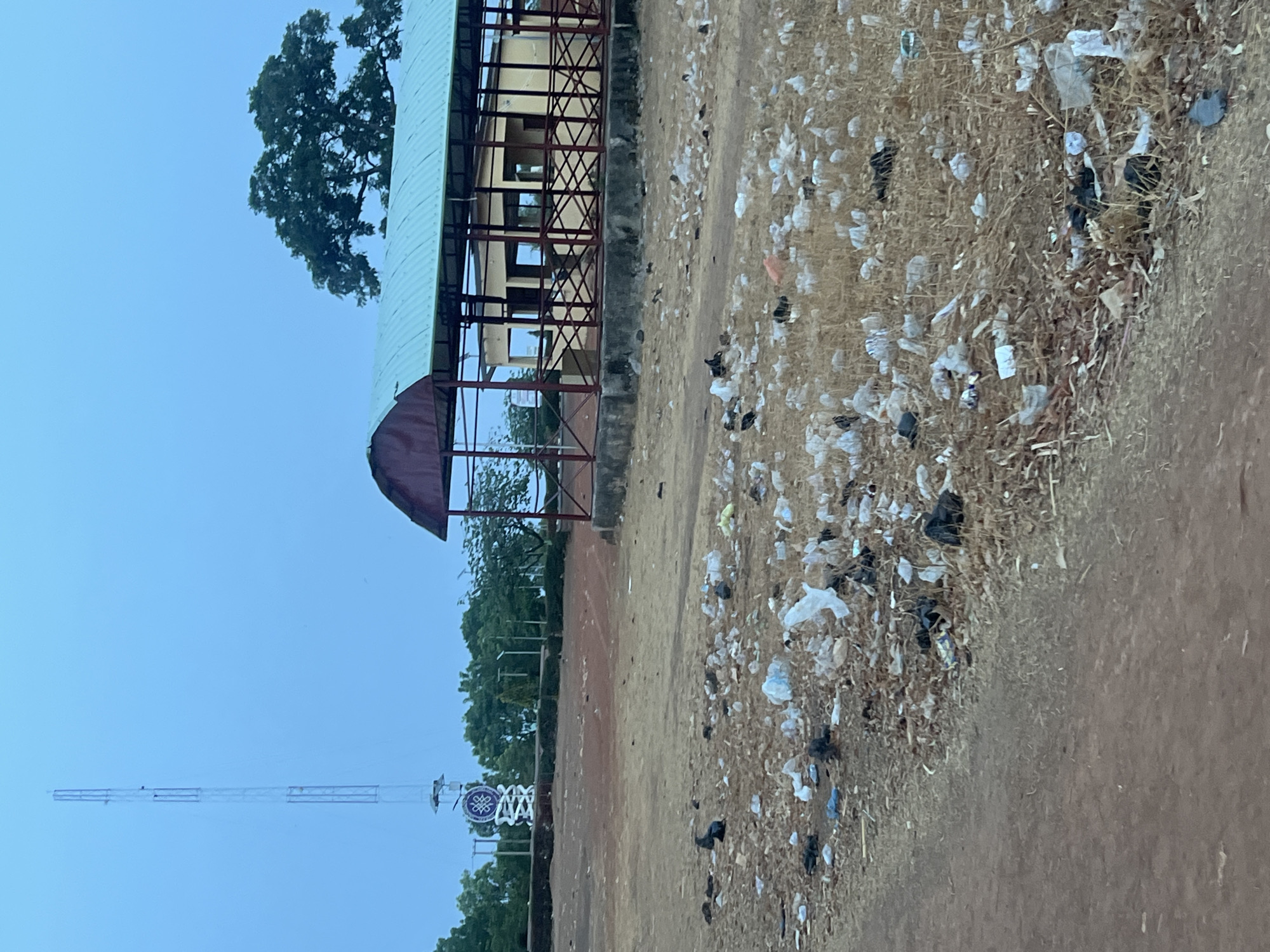The image depicts an outdoor scene in Unknown, Nigeria, characterized by an area littered with trash, predominantly plastic bags and debris, scattered across dry grass and dirt