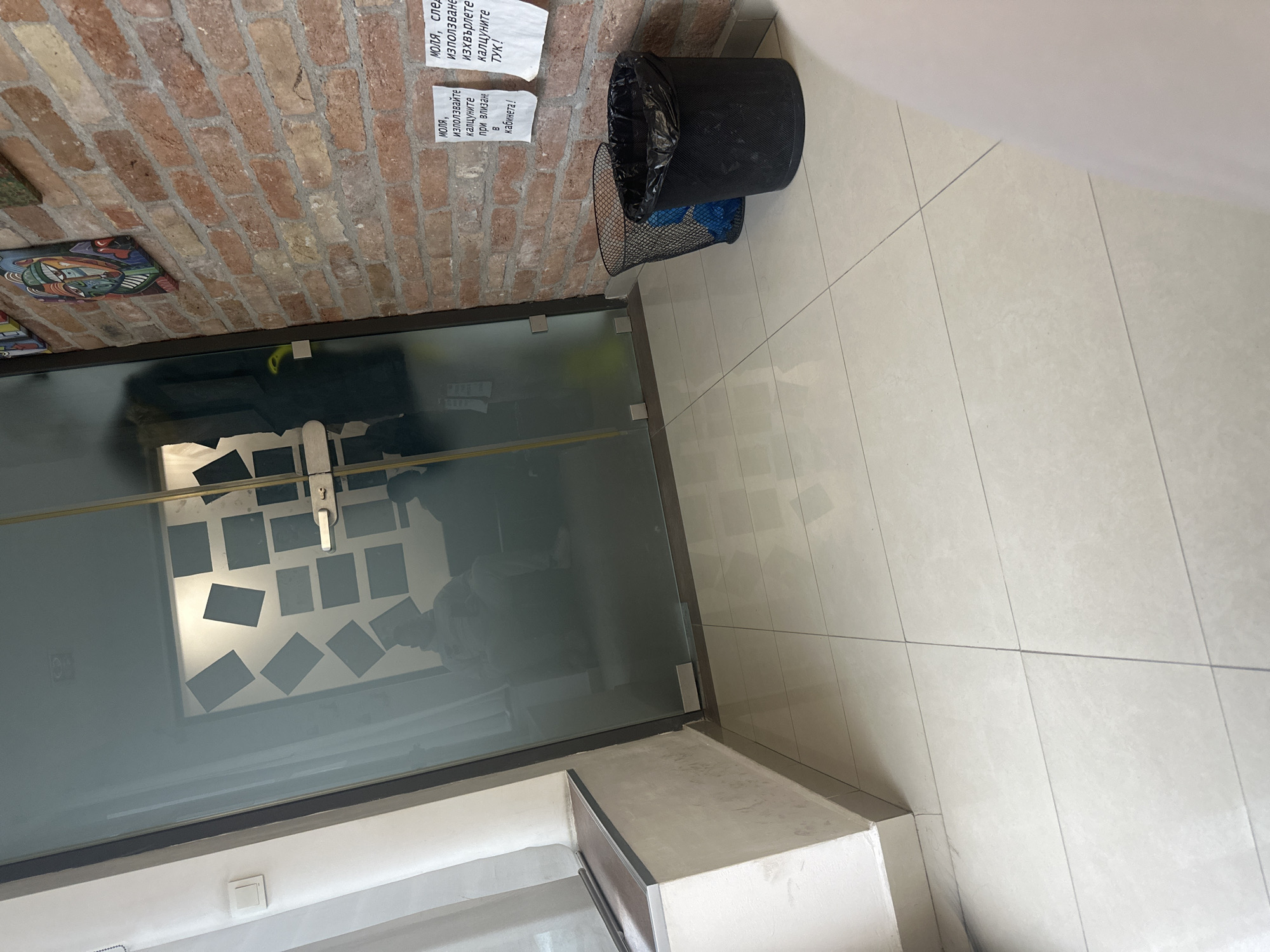 This image depicts an interior waiting area or hallway in Shumen, Bulgaria, leading to an office or medical cabinet. The scene is dominated by a frosted glass door in the center, an exposed red brick wall on the right, and a light-colored wall with a window section on the left. Through the frosted glass door, two indistinct human figures are partially visible, seated inside a room. One figure appears to be wearing a light-colored hooded garment. On the far wall inside the room, numerous dark, rectangular objects are affixed in a seemingly random pattern. A dark garment or object hangs inside the room to the right of the door's silver handle, and a bright yellow object is visible on the floor near the bottom of the glass. To the right of the glass door, an exposed red brick wall features varying shades of red, orange, and brown bricks. A colorful, abstract painting of a face, primarily in blue, red, green, and white, is mounted on this wall, with a smaller greenish abstract piece partially visible above it. Two white paper signs with Bulgarian text are taped to the brick wall. The left sign states, "МОЛЯ, използвайте калцуните при влизане в кабинета!" (Please, use shoe covers when entering the office!). The right sign reads, "МОЛЯ, СЛЕД ИЗПОЛЗВАНЕ ИЗХВЪРЛЕТЕ КАЛЦУНИТЕ ТУК!" (Please, after use, throw shoe covers HERE!). Below these signs, on the light-colored tiled floor, are two waste bins: a black wire mesh bin containing a blue plastic liner, positioned behind a solid black plastic bin with a black liner. On the left side of the scene, a light-colored wall section features a white rectangular light switch. Below this, a low white ledge or counter with a brown/grey top trim extends towards the foreground. The wall beneath the ledge exhibits minor scuff marks or discoloration. The entire floor is covered with light-colored, possibly off-white or cream, square tiles with dark grey grout lines. A portion of a person's light-colored leg or arm is visible in the bottom right corner of the frame.