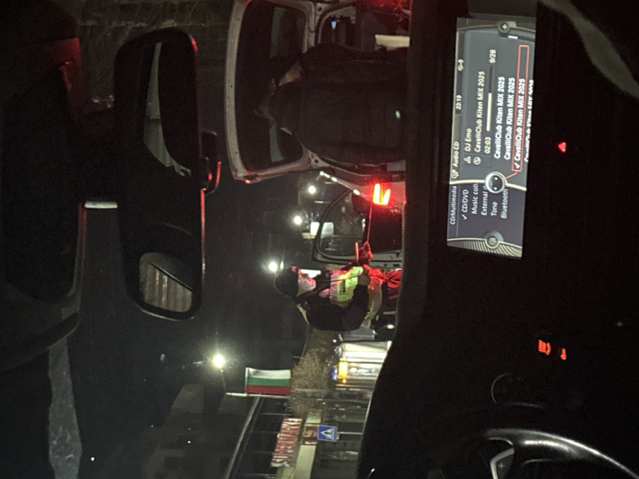 The image depicts a nighttime street scene in Primorsko, Bulgaria, observed from the interior of a vehicle. On the vehicle's dashboard, an infotainment screen displays "CD/Multimedia" options, showing "CavalliClub Kiten MIX 2025" and the time 23:19. Outside, under artificial illumination from streetlights, a male individual is visible wearing a dark jacket, a fluorescent yellow/green safety vest, a dark beanie, and a white face covering. He stands next to the open driver's side door of a white vehicle, appearing to hold an object in his hands. A red rope or string extends from the open driver's door area of the white vehicle. The white vehicle's trunk is also open, and two other individuals, dressed in dark winter jackets and beanies, are positioned near the open trunk, seemingly interacting with its contents. In the background, a building displaying a "SUPERMARKET" sign is visible. A Bulgarian national flag (white, green, red vertical stripes) hangs from a pole on the left, confirming the country. A blue pedestrian crossing sign is also present on the left side of the street.