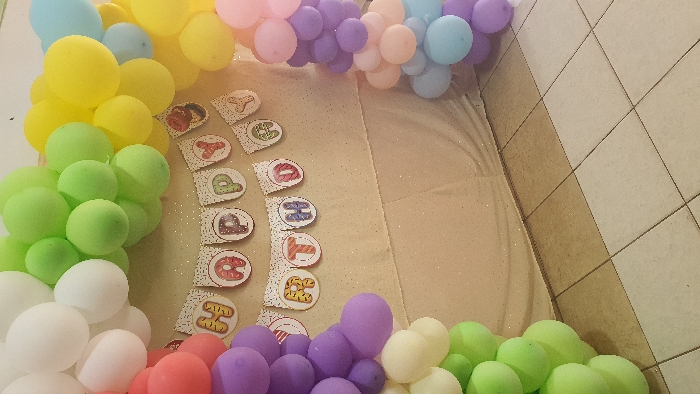 An indoor scene in Kisumu, Kenya, displays a celebratory decoration setup. The central background features a light-colored, possibly cream or light gold, fabric backdrop with a subtle glitter texture, draped to cover a wall. Suspended horizontally across the upper portion of the backdrop is a "HAPPY BIRTHDAY" banner composed of individual, decorated letter flags. Each letter appears on a circular or scalloped cutout with distinct patterns, such as sprinkles or stripes. Framing the backdrop are colorful balloon garlands forming an arch. These garlands consist of densely packed balloons in various hues, including white, light green, yellow, light blue, pink, lavender, and red/orange, arranged in a rainbow-like progression from the left side, across the top, and down the right side. The floor in the foreground is tiled with square ceramic tiles, arranged in an alternating pattern of light beige and light brown. No people, subjects, actions, or interactions are present in the image.