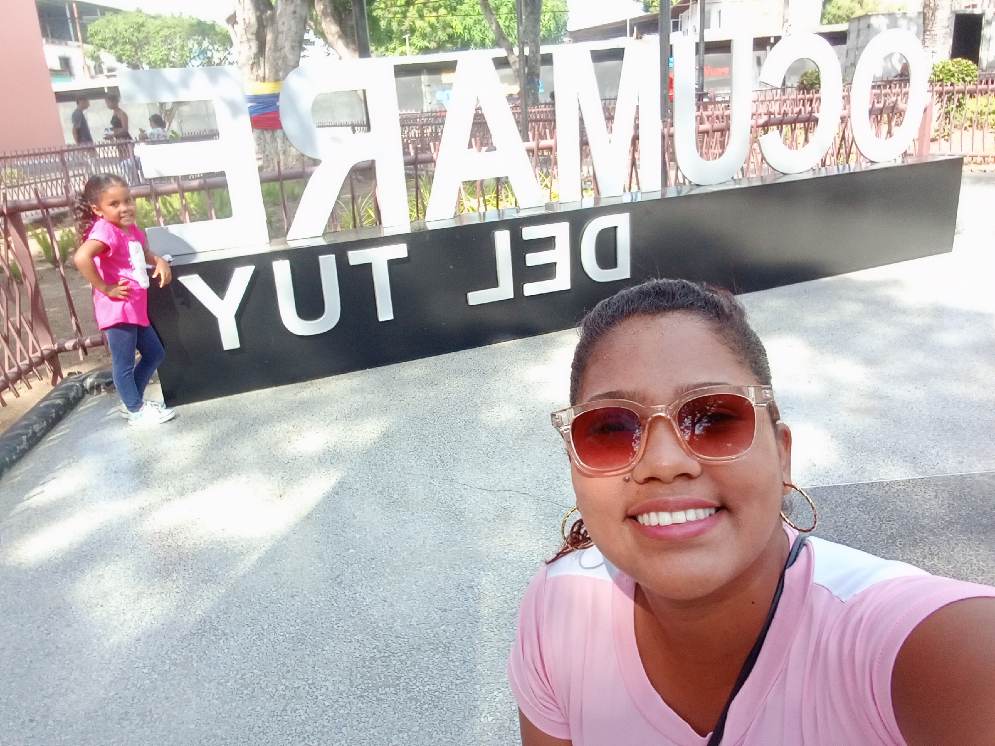 The image displays an outdoor daytime scene in Parroquia Ocumare, Ocumare del Tuy, Venezuela. In the lower right foreground, a woman with dark skin, dark hair, wearing clear-framed sunglasses with reddish lenses, a pink short-sleeved top with a white shoulder panel, and golden hoop earrings, smiles directly at the camera while taking a selfie. Her upper torso is visible. To her left, in the midground, a young girl, estimated to be between 4 and 6 years old, with dark skin and dark curly hair, stands with her hands on her hips. She wears a pink short-sleeved t-shirt with a white design, dark blue leggings, and white sneakers, looking towards the camera with a smile. Between the woman and the girl, a prominent landmark sign is centered horizontally. It features large white capital letters on a black rectangular base. The upper line reads "OCUMARE" (right-side up), and the lower line reads "DEL TUY" (inverted relative to the upper line, suggesting it's designed to be read from the opposite side as well). Behind the sign and the girl, a brown metal fence stretches across the midground. Beyond the fence, a background includes green trees, several indistinct individuals, and partial views of buildings. A Venezuelan flag, characterized by yellow, blue, and red horizontal stripes, is tied to a tree trunk in the mid-background to the right of the "OCUMARE" letters. The ground is a light gray, speckled paved surface, exhibiting patches of bright sunlight and shadows.