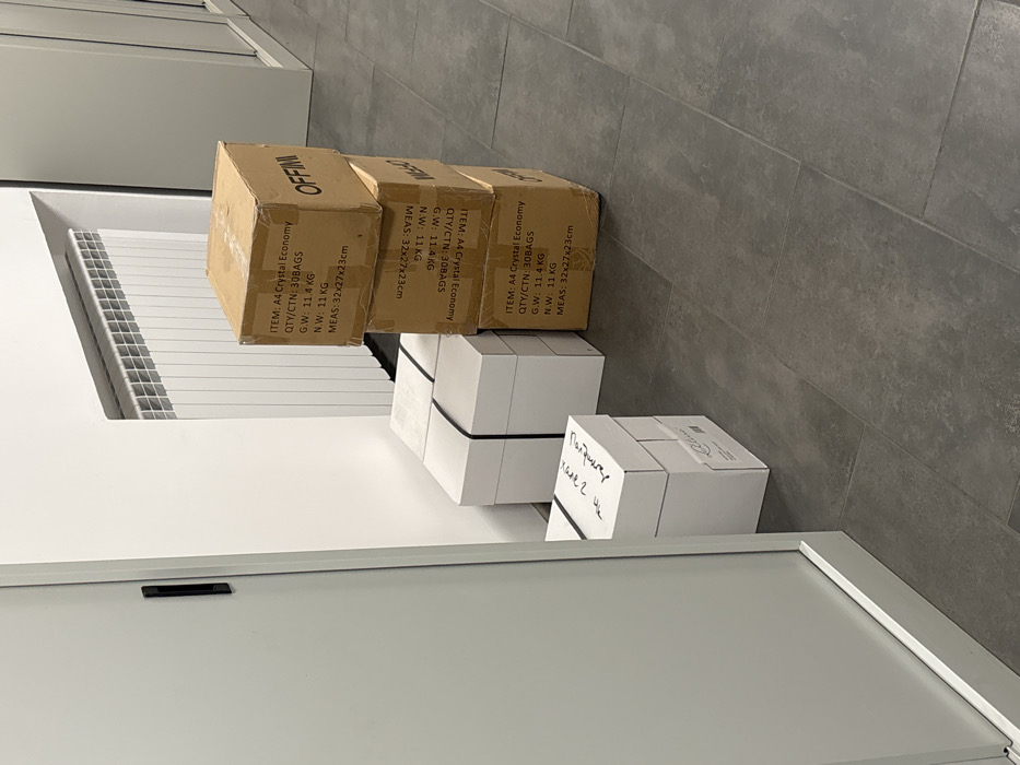 - "The image depicts an indoor scene in Ruptsi, Bulgaria, featuring several stacked packages on a dark gray tiled floor against a white wall" by FM-vLEav1, licensed under CC BY 4.0