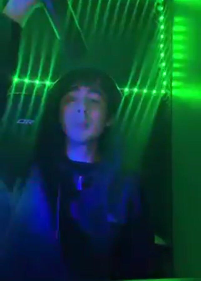 A young man is singing and dancing in front of a set of changing colored lights. He is wearing a black jacket and a black hat. He is sitting in a gaming chair and holding a game controller in one scene. The lights change between red, green, and blue.