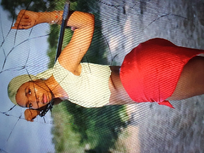 The image presents a dark-skinned individual in an outdoor environment, stated as Ijegun, Nigeria. The person, appearing female, is positioned slightly angled left, gazing directly at the camera. She wears a light green head wrap, a light yellow/cream ribbed short-sleeved crop top, and a red ribbed fabric wrapped around her lower body, tied on the left. Several bracelets adorn her left wrist. Both hands hold a dark, slender staff-like object across her upper back, with elbows bent upwards. The background features blurred green vegetation and lighter ground beneath a light sky. The entire scene is marred by a pervasive network of irregular cracks and a visible pixel grid, characteristic of a photograph taken of a damaged digital screen.