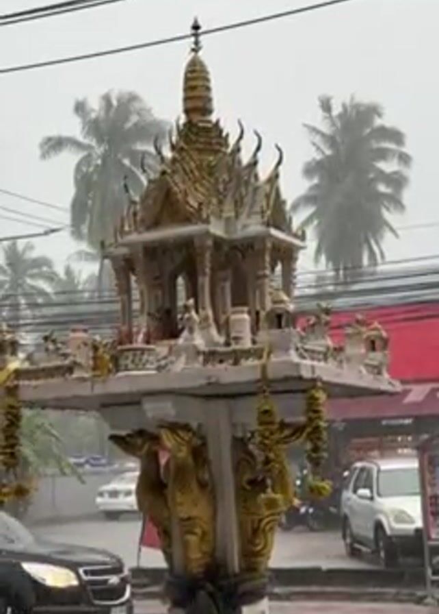 small, ornate, spirit house in Thailand during a heavy rainstorm