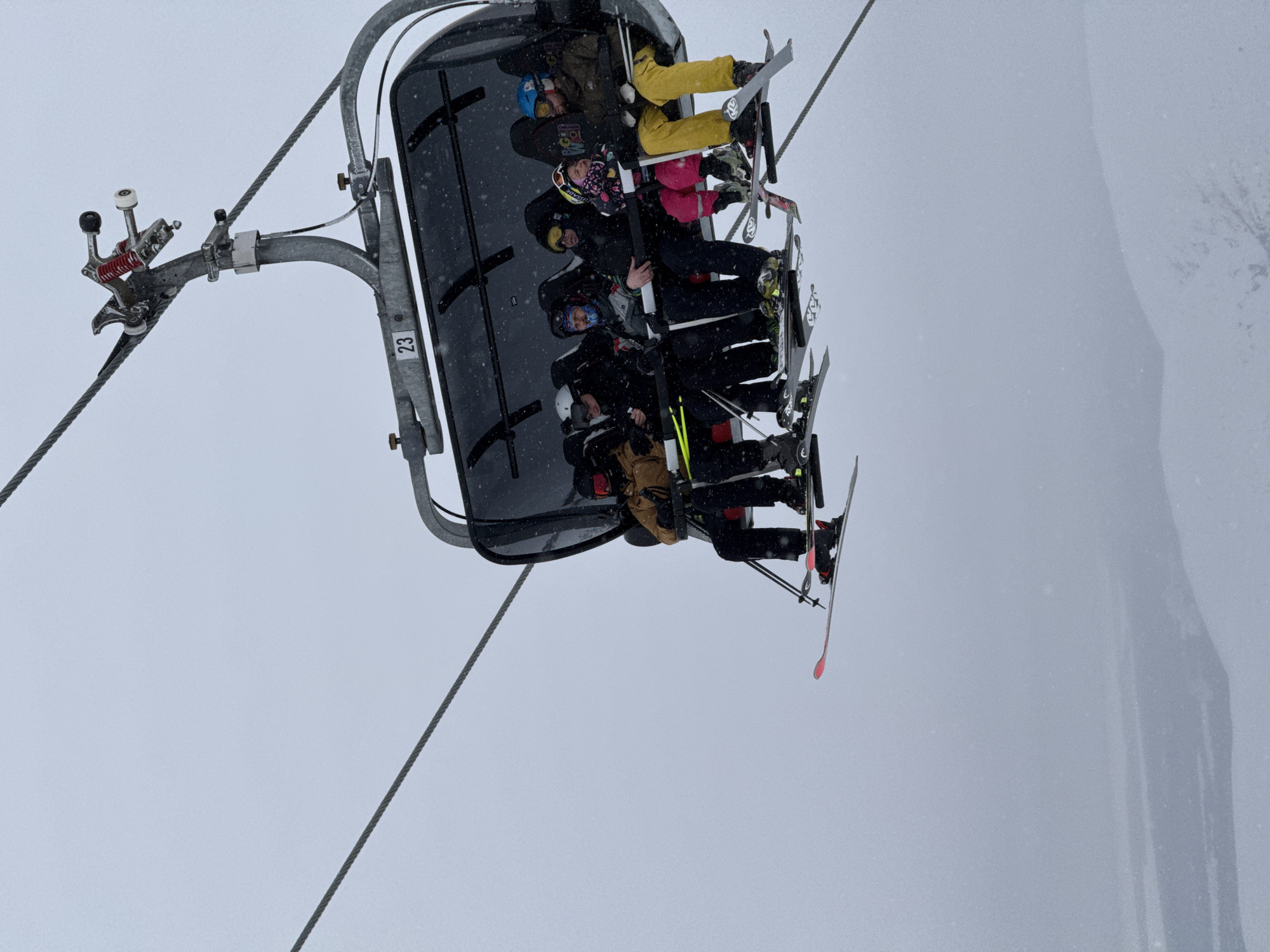 A detachable six-person ski chairlift, numbered "23", transports six individuals upward through a snowy environment in Kirovsk, Russia. The metal chairlift structure connects to dual overhead cables via a grip mechanism. Light snowfall is evident against the overcast, light gray sky. From left to right, the occupants are: 1. An individual in a tan jacket, black pants, black helmet, and red goggles, holding ski poles. Their skis are red-tipped. 2. An individual in a black jacket, black pants, white helmet, and dark goggles, holding ski poles. 3. An individual in a patterned gray and black jacket, black pants, a blue and black balaclava, and dark goggles. 4. An individual in a black jacket, black pants, yellow helmet, and yellow goggles. 5. A child in a pink jacket, pink pants, a colorful helmet, and pink goggles. Their skis are pink and white. 6. An individual in a brown jacket, yellow pants, blue helmet, and blue goggles, holding ski poles. Their skis are silver and black. All individuals are seated with a safety bar down, wearing ski apparel and equipment, including helmets and goggles. Their skis hang below the chair. The terrain below is a snow-covered slope, obscured by light snowfall and low visibility conditions.