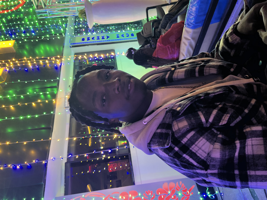 A person with braided hair is shown wearing a plaid jacket over a hooded sweatshirt. They are facing the camera with a neutral expression. Behind them are rows of colorful lights, strung vertically along a building. A sign with lettering, possibly a business name, is partially visible above the person, along with what appears to be a decorative pot. Some items, possibly luggage or bags, are stacked on a surface behind the person's shoulder.