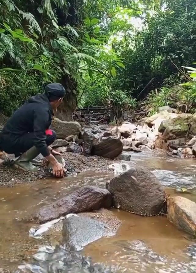 A man in a black outfit and boots crouches by a shallow, rocky stream, then stands up and walks further into the scene, towards a small set of wooden steps. The stream is surrounded by dense green vegetation.