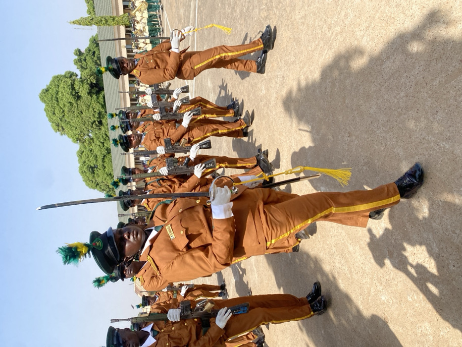 The image displays a formation of approximately 15 individuals in uniform marching on a light-colored, unpaved parade ground under a clear blue sky. The individuals wear brownish-orange long-sleeved jackets with epaulets and breast pockets, paired with matching trousers featuring a prominent vertical yellow stripe down the outer seam. Each wears a dark green peaked cap with a green and yellow feather plume, white gloves, and polished black shoes. The lead individual, positioned in the foreground with their left leg forward, is dark-skinned and has a nametag visible as "A. F. S. MUSAU" on their right breast pocket. This individual holds a ceremonial sword vertically in their gloved right hand, with a yellow tassel hanging from the hilt. Behind them, the other members of the formation, also in mid-stride, carry what appear to be ceremonial rifles, held across their bodies with the buttstock downwards and the barrel pointed upwards. Some rifles display white numbers on the stock, such as "779" and "775." In the far background to the right, a marching band in green uniforms is partially visible, holding brass instruments. Behind the band and further left, low-rise buildings with light-colored walls and a darker roof are seen, along with green trees. Strong, direct sunlight casts distinct shadows of the marching individuals onto the ground. This event is located at the Nigerian Security and Civil Defence Corps (NSCDC) College of Peace and Disaster Management, Katsina Road, Kaduna, Nigeria.