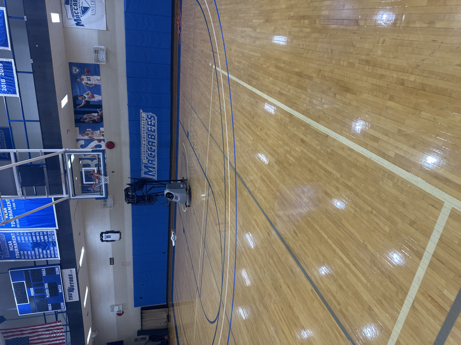 The image depicts a basketball court, likely inside a gymnasium, with shiny wooden floors marked with white and blue lines