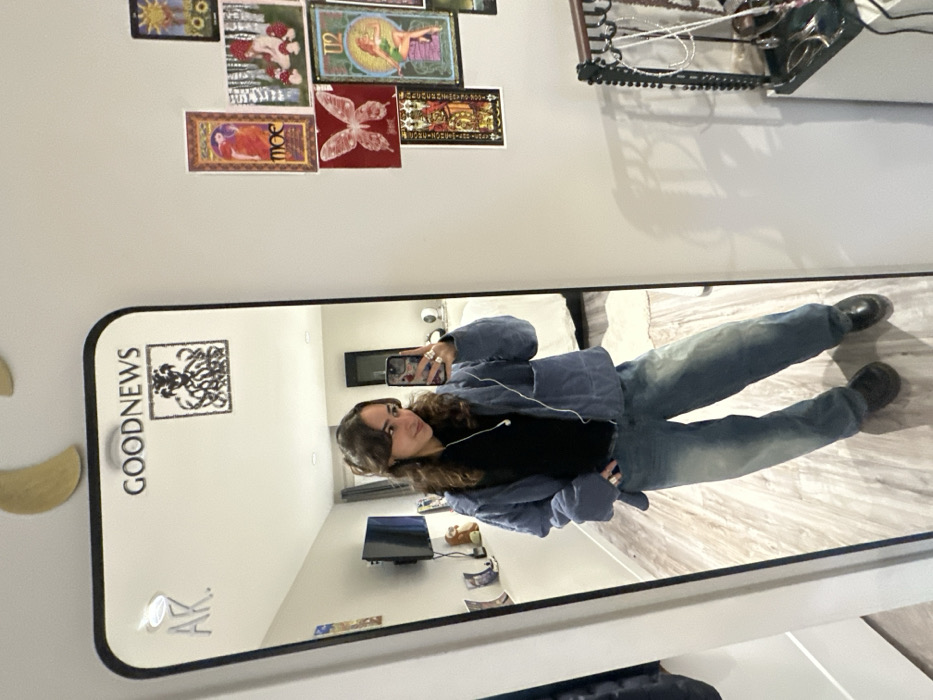 A mirror selfie shows a woman wearing blue jeans, a black top, and a light blue quilted jacket