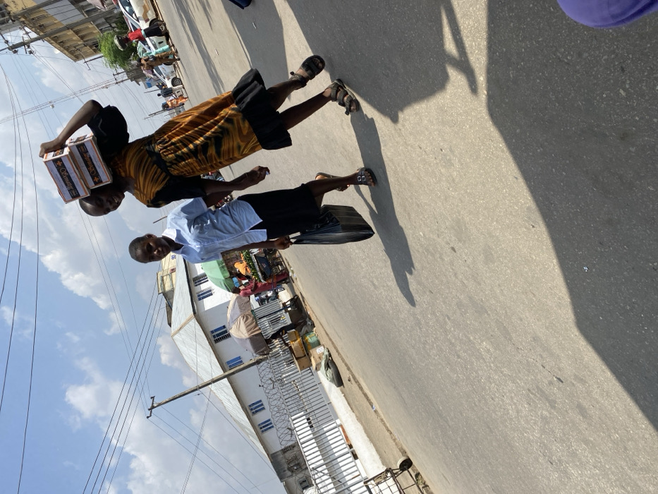 A bright outdoor street scene in Ibadan, Nigeria, under a partly cloudy sky with prominent shadows on the paved road