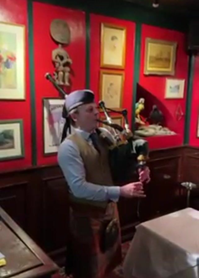 A man wearing a kilt, waistcoat, light blue shirt, and a matching blue hat is playing bagpipes in what looks like a restaurant or bar. The walls are red with dark wood paneling around the lower half, and decorated with various paintings, portraits, and a sculpture. A table covered with a white tablecloth stands next to him, and a dark wooden counter is to his left. He is standing in a corner of the room and focusing on playing the instrument.