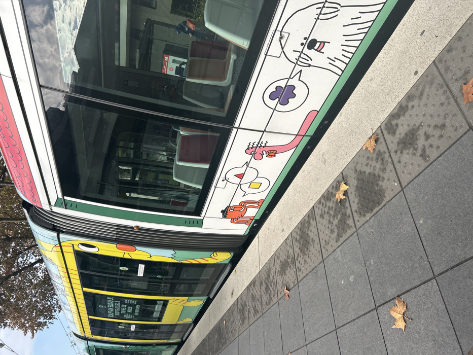 A modern, articulated tram, identified as part of the Strasbourg public transport system, is stationary at a grey tiled platform under an overcast sky. The tram's side is extensively decorated with vibrant, cartoon-style illustrations featuring various characters, including a large yellow creature, a red spider with multiple eyes, a pink worm-like figure, and a white shaggy dog, all depicted with speech bubbles containing abstract shapes. The upper section of the tram near the rear is painted with a red tiled roof design, and a green stripe runs along the lower edge. Large windows reflect elements of the surroundings, including portions of a building and the sky. Inside the tram, rows of light-colored and red/orange seats are visible. A clear reflection in the window shows an individual wearing a dark hooded garment standing near a red ticket vending machine or information kiosk on the opposite side of the tracks or another platform. The grey platform pavement exhibits scattered wet patches and several fallen, dry brown leaves, indicating an autumn season. The background reveals sparse, autumnal tree foliage against the sky. The scene depicts a tram stop environment within the city of Strasbourg, France.