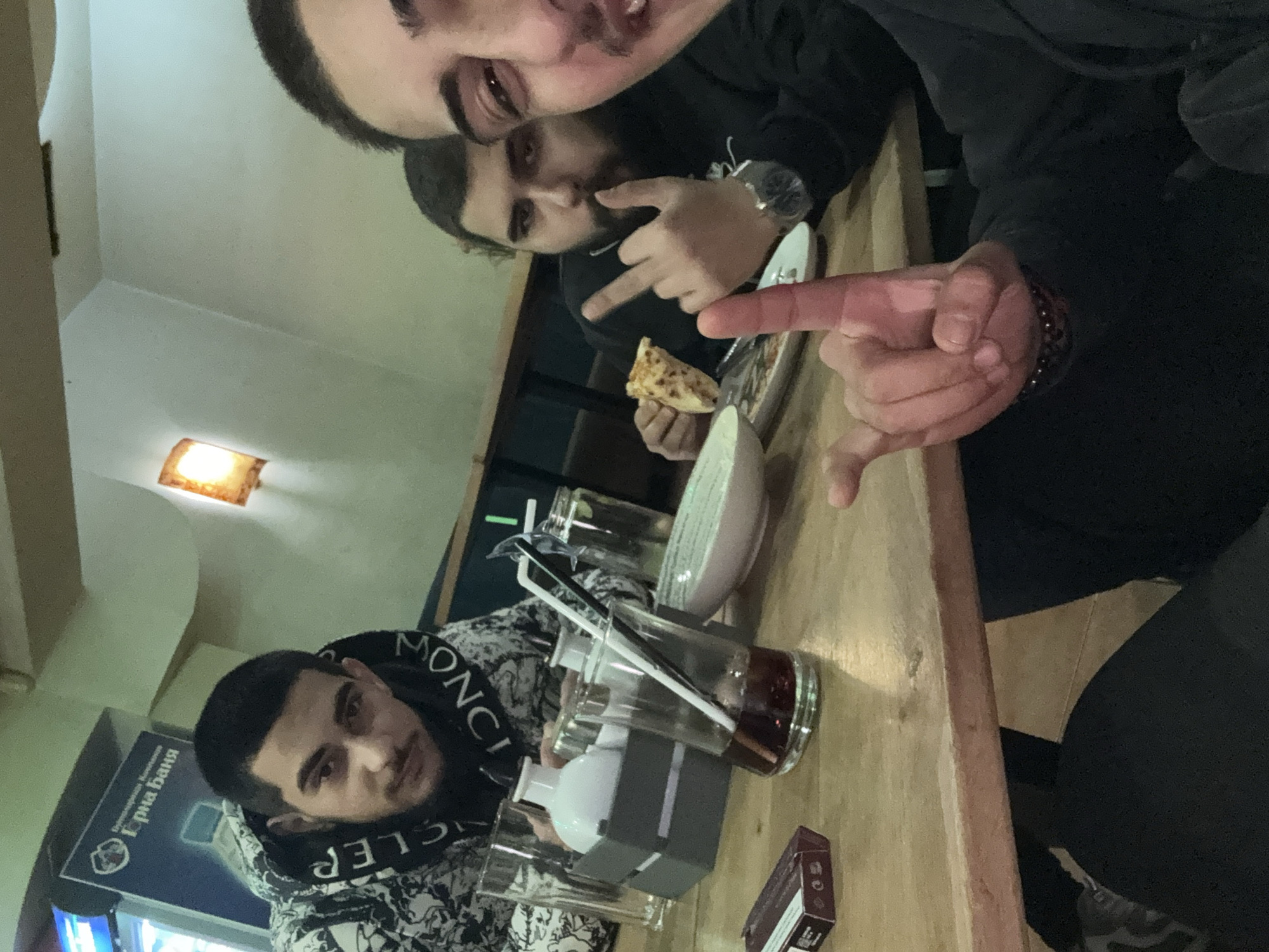 Three men sit at a wooden table in an indoor setting. They are likely in a restaurant. The man at the bottom left wears a white patterned jacket with "MONCLER" on the hood. A drink in a glass with straws and a small box of cigarettes are on the table near him. One man holds a slice of pizza. A wristwatch is on his wrist. The walls are white, and a sign in Cyrillic (possibly “Горна Баня”) is visible. Location: Troyan, Bulgaria.