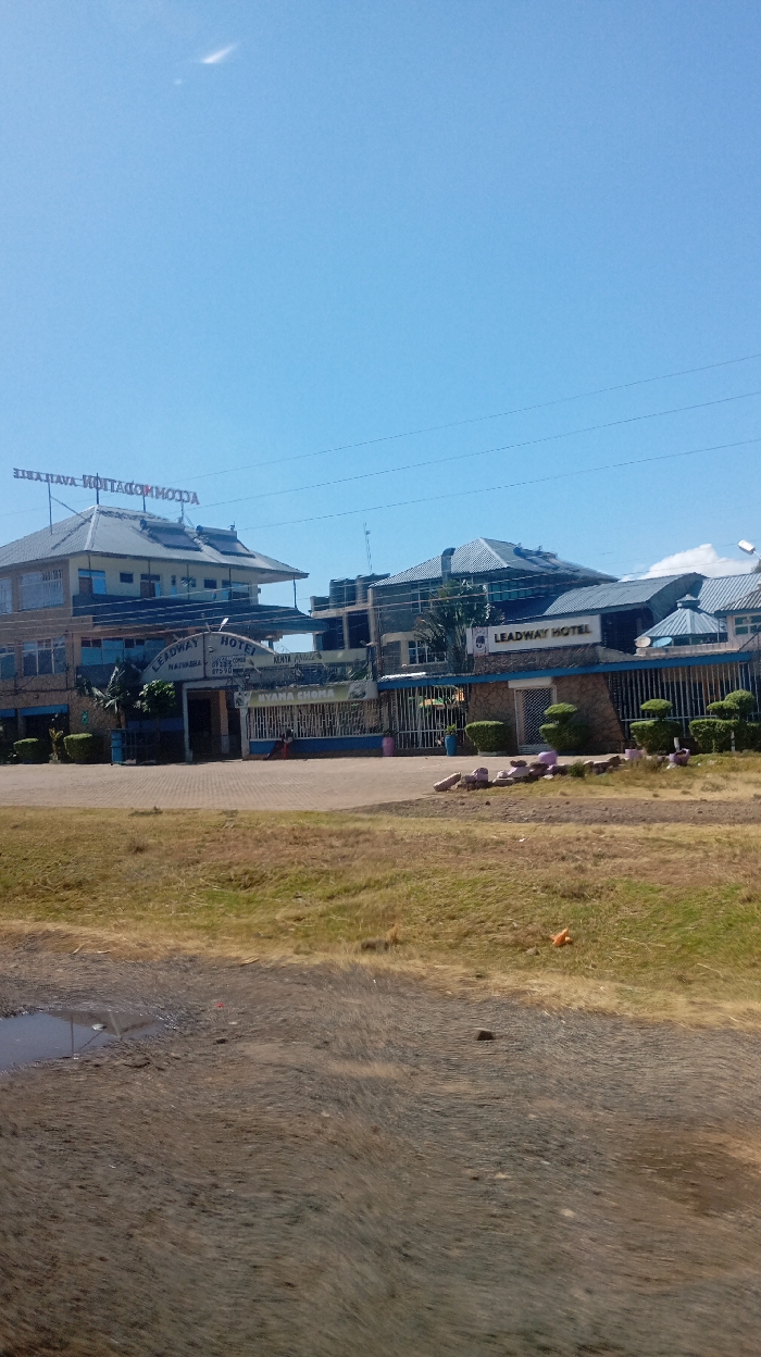Leadway Hotel, a multi-story building under a clear blue sky. The hotel's signage is prominently displayed. A grassy lawn and a paved area border the hotel's entrance. The foreground reveals a rough, dirt road with a small puddle. Power lines stretch across the sky above the building.