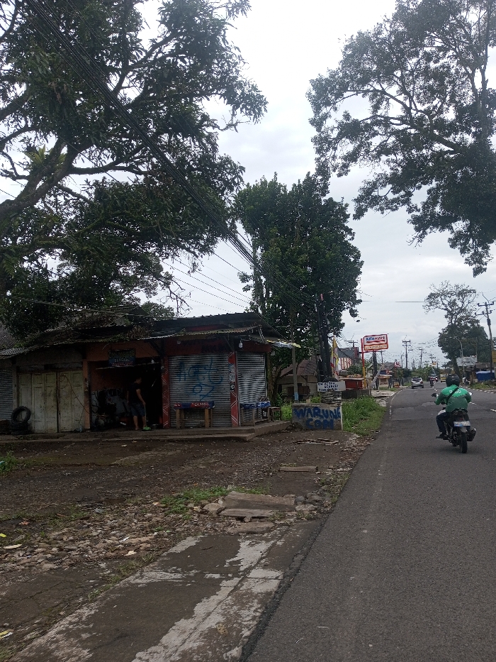 A roadside scene presents a rundown shop with graffiti-covered shutters, nestled beneath sprawling trees. Adjacent to it is a narrow paved area, transitioning into an asphalt road. A motorcyclist wearing a green shirt is traveling down the road. In the distance, an Alfamart convenience store sign is visible alongside other buildings and passing vehicles. The sky is overcast, suggesting a cloudy day.