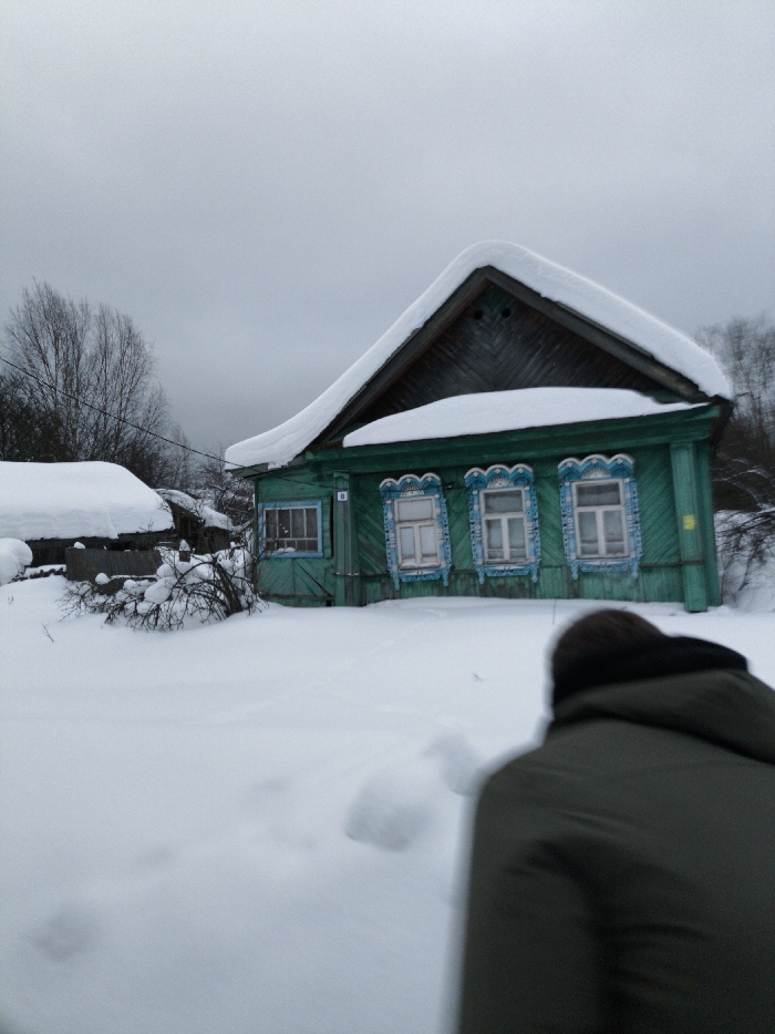 The image depicts a snow-covered winter scene in Красный Маяк, Russia, under an overcast, gray sky. In the mid-ground, a single-story wooden house with vertical green siding stands prominently. Its steeply pitched roof is heavily laden with a thick, rounded layer of snow. The house features three front-facing windows with ornate, carved teal-blue wooden frames (nalichniki) and a smaller, plainer window on its left side. A Cyrillic letter 'B' (likely a house number) is affixed below the smaller window. To the left and slightly behind this house, another smaller, heavily snow-covered wooden structure with a flatter roof is partially visible, fronted by what appears to be a wooden fence. Bare deciduous trees are visible in the distant background, along with a snow-covered bush in the mid-ground. In the immediate foreground, the back of an out-of-focus individual is visible, wearing an olive-green hooded jacket with a dark collar/hood lining. The person is positioned facing away from the camera, seemingly walking through the deep, undisturbed white snow towards the green house.