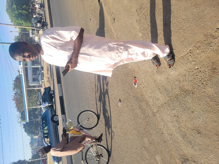 The image depicts an outdoor urban scene in Bauchi, Nigeria, specifically identifiable by the prominent Mobil petrol station visible in the background. In the foreground, a male subject, appearing to be an adult, stands on an asphalt surface, facing slightly away from the camera and looking to his right. He is dressed in a light-colored (possibly light pink or off-white) patterned tunic and matching trousers, with dark sandals on his feet. He holds a dark-colored smartphone in his left hand. Directly in front of him on the ground are scattered pieces of red and white litter. In the midground, to the left, another adult male with a beard, wearing light brown traditional attire and a matching cap, rides a light-colored bicycle. Yellow material is attached to the bicycle's handlebars. He is moving from left to right across the frame, positioned on a paved road. Behind him, a blue station wagon is visible on the same road. The background features the Mobil petrol station with its blue and white canopy and multiple fuel pumps. Several vehicles, including cars and motorcycles, are present on the road and around the petrol station, indicating active traffic. Utility poles and trees line the street under a clear sky. The scene is brightly lit by natural sunlight, casting distinct shadows.