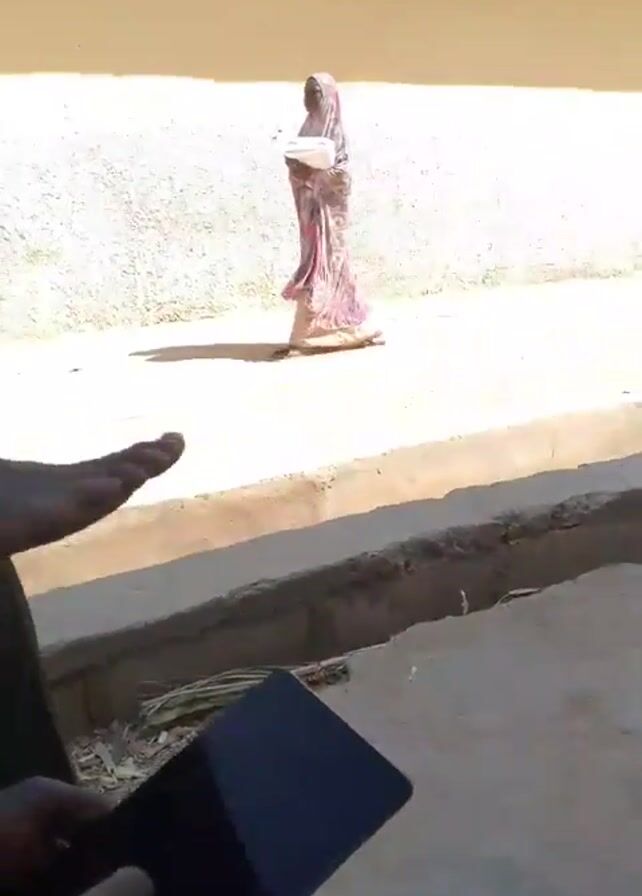 A person sits in an outdoor area holding a tablet. Another person, wearing a head covering and long patterned dress, walks in the background. The seated person appears to be filming or taking a picture of the person walking by. The environment includes a concrete structure and a dirt or sand ground.