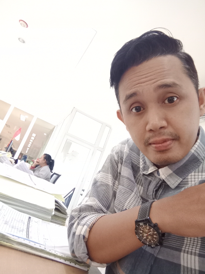 A man in a grey and white plaid shirt wears a black watch on his left wrist. He looks directly at the camera with a slight smirk. Behind him, a stack of papers sits on a desk. In the background, another woman is visible, seated at a desk and talking on a phone. An Indonesian flag is visible through a window in the distance. Overhead are ceiling lights. The image is taken from a low angle.