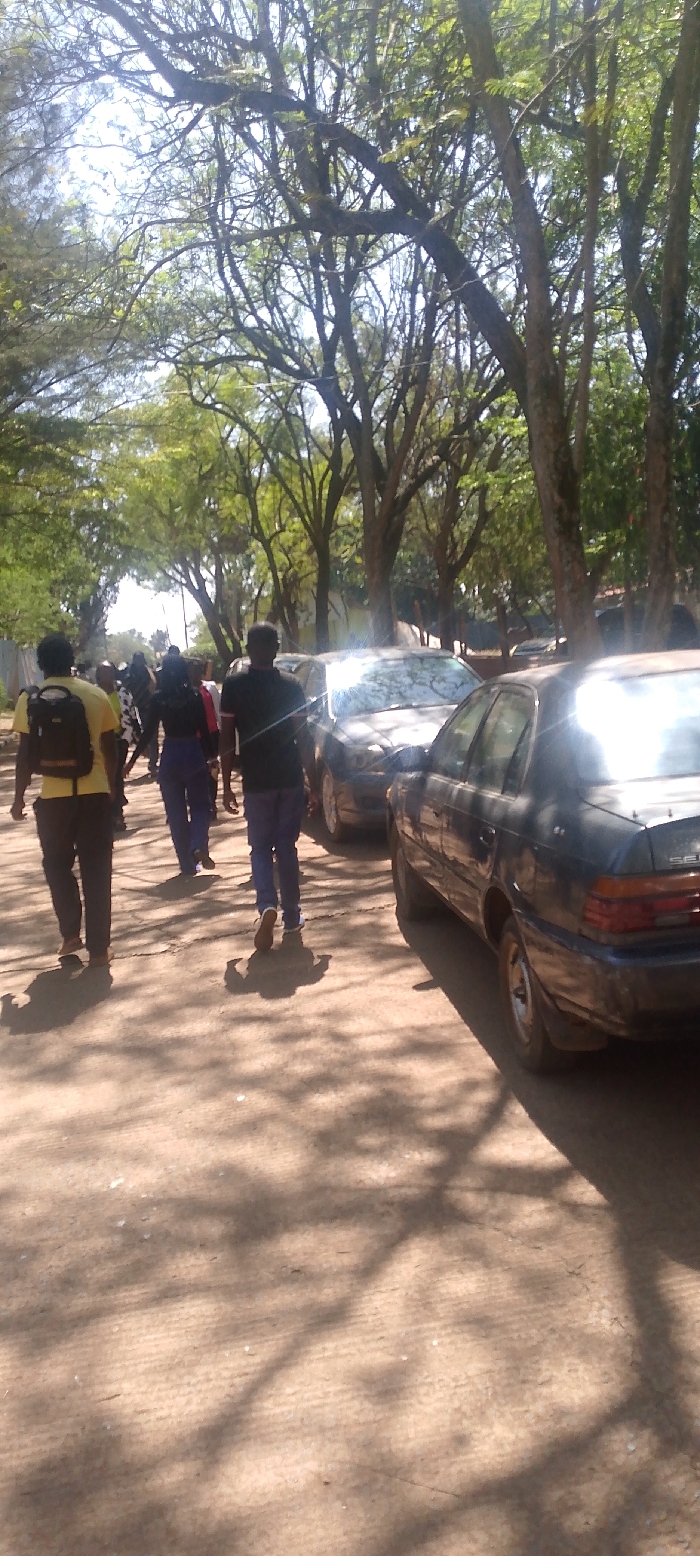 A sunny dirt road lined with tall trees casts shadows over a group of people walking alongside parked cars